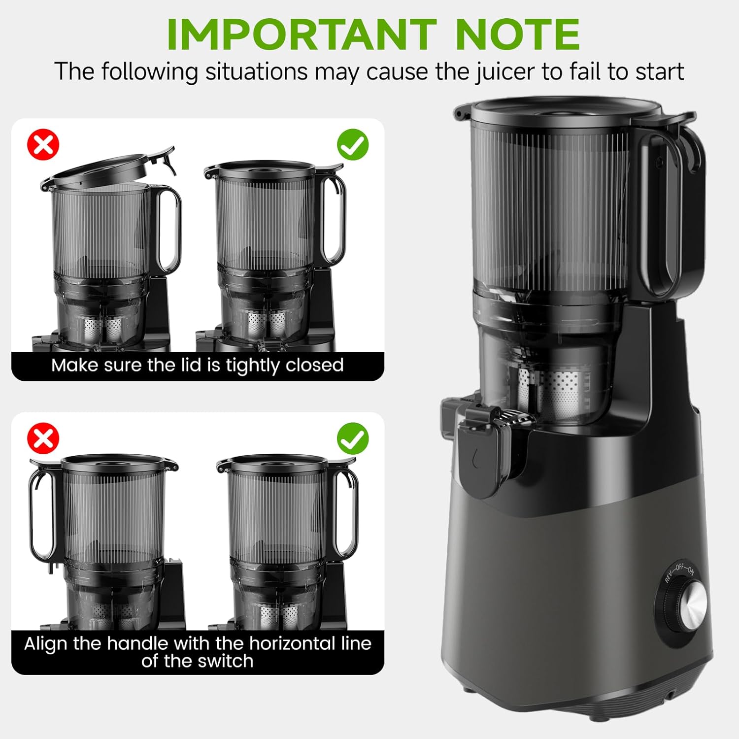 - 【Troubleshooting Guide】To ensure the proper operation of the juicer, please follow these troubleshooting steps: 1.When installing the juicer, ensure that the handle is precisely aligned with the start button. 2.Ensure that the lid is tightly closed.After completing the above - mentioned checks, if the problem persists, please contact us for a solution!.
