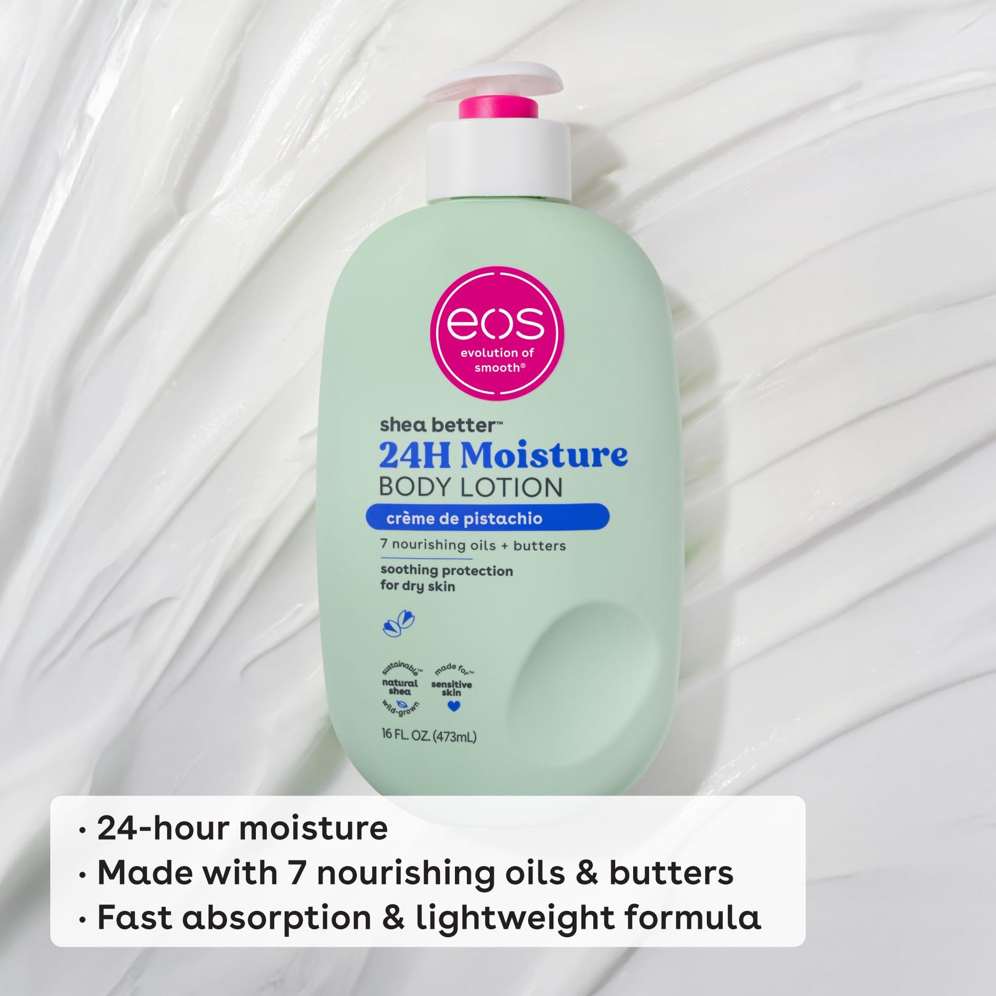 • SUSTAINABLE SKIN CARE: Protect and moisturize with eos Shea Butter Body Lotion that includes 7 nourishing oils + butters, like natural shea butter and shea oil. Enjoy delightful fragrances that last all day on skin