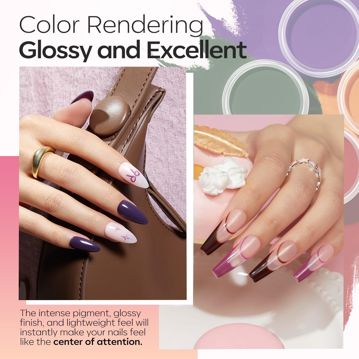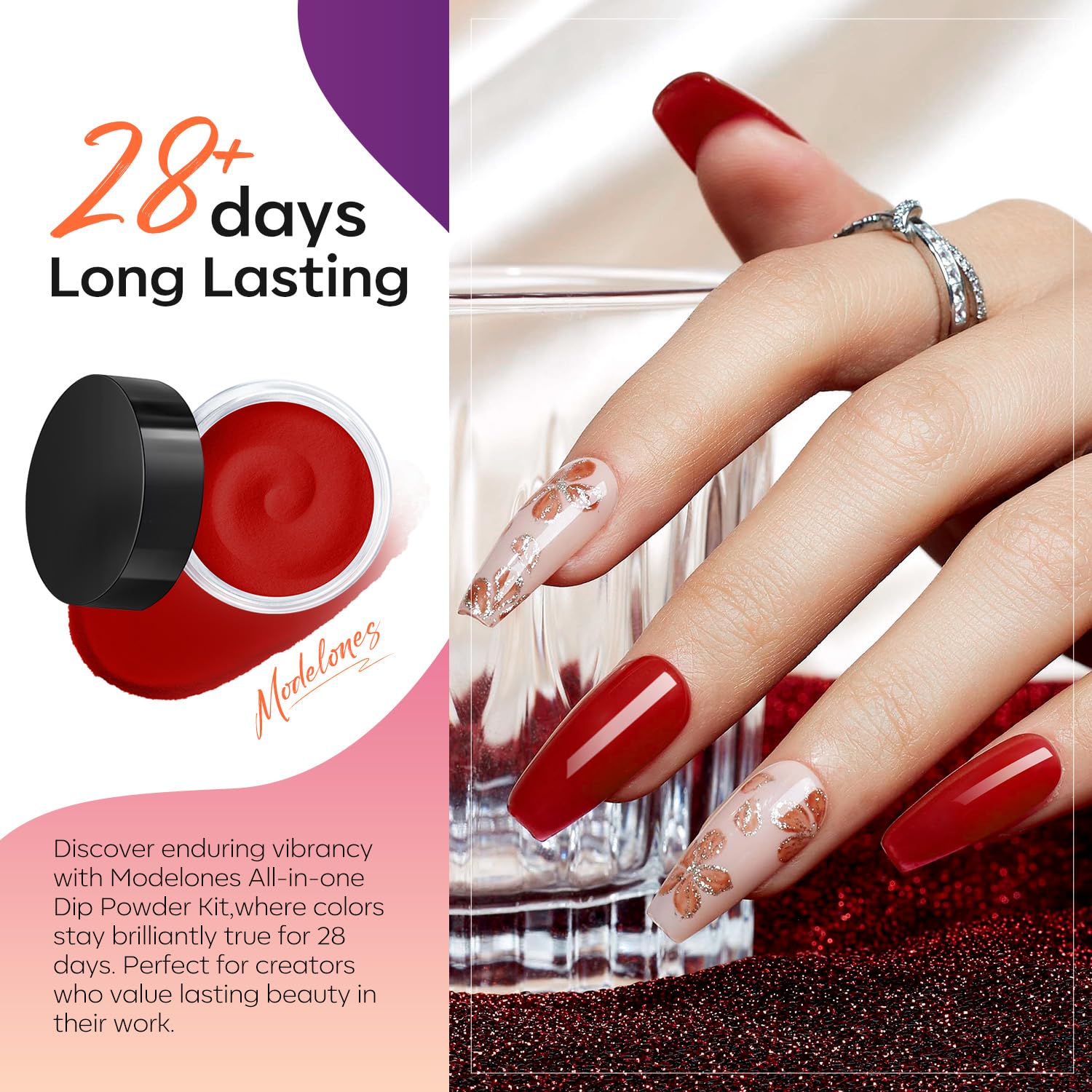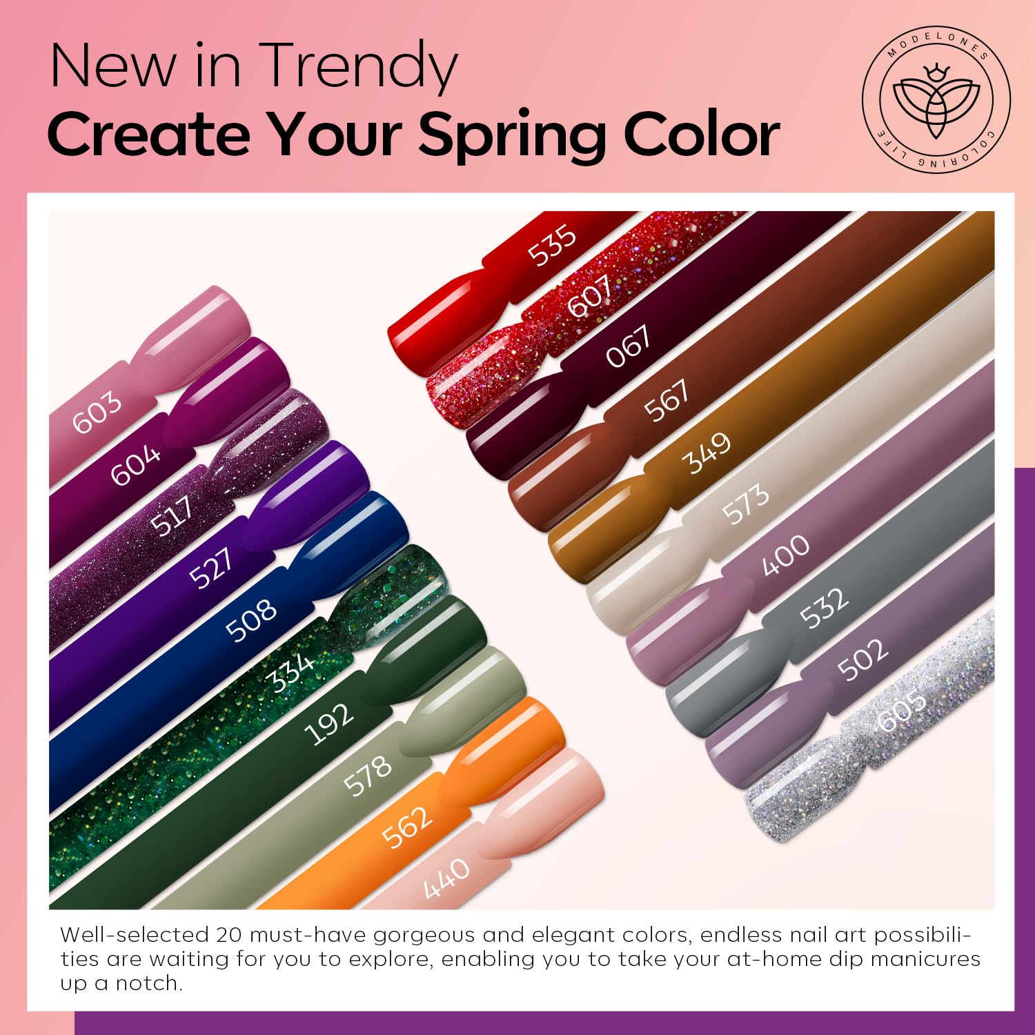 - DIP POWDER: This dip powder nail kit features 20 trendy colors: purple, green, red, balck, blue and pink (0.35 oz each), Over a hundred combinations, perfect for any season. Whether you're going for a professional, polished look for work or a glamorous style for a night out, this nail dip powder kit is ideal for any occasion