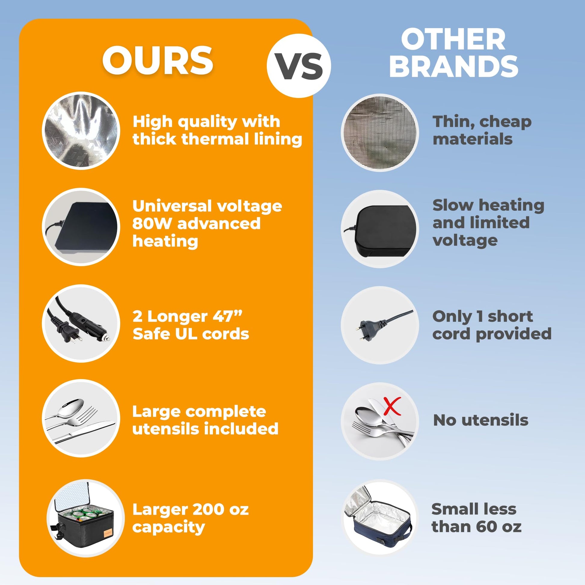 - FITS A VARIETY OF CONTAINERS: This portable food warmer lunch box is designed to accommodate most oven-safe flat-bottom containers, including glass, metal, and aluminum foil. With its large 200oz capacity, it works perfectly as one of the best car food warmers for vehicles, letting you heat hearty portions of your favorite meals effortlessly.