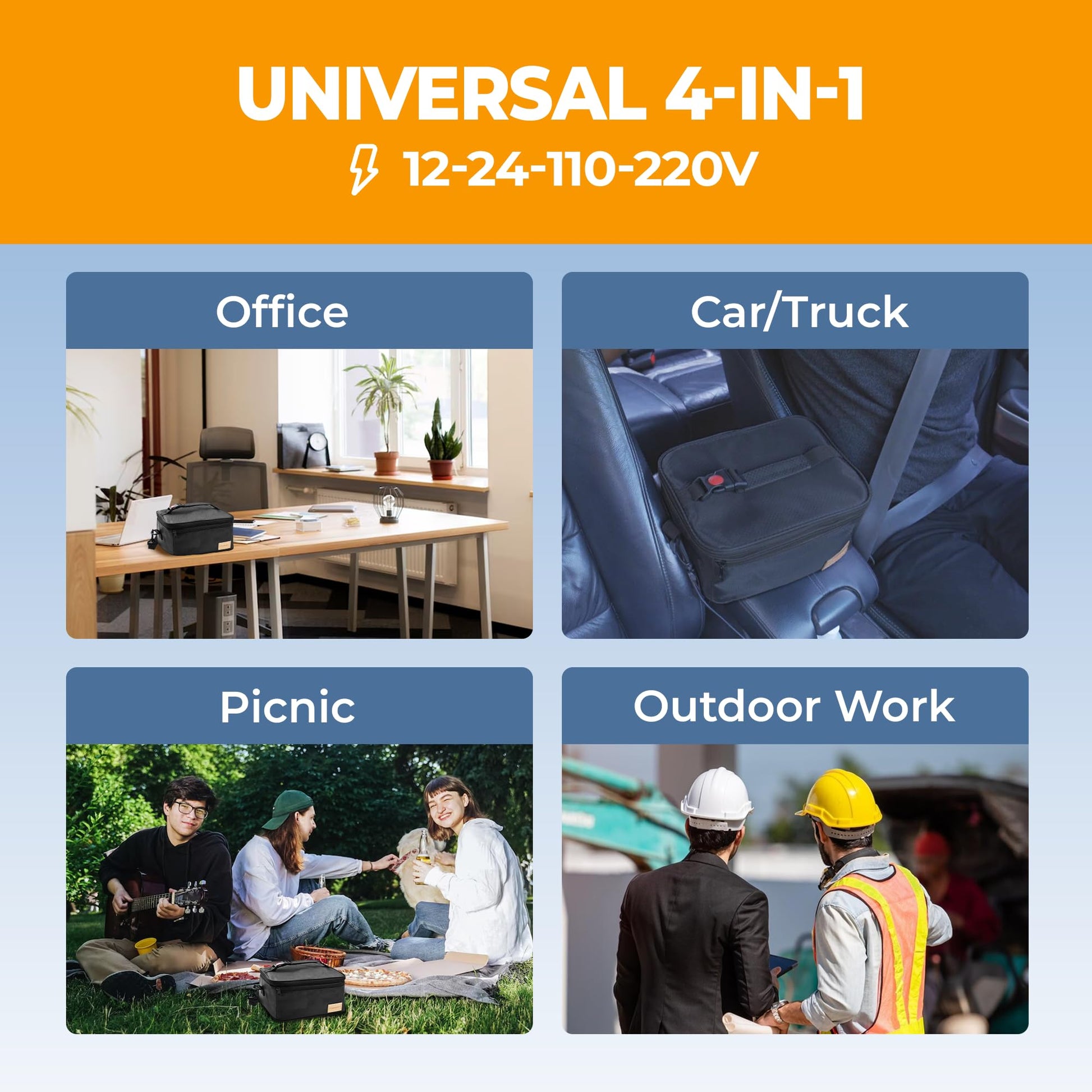 - VERSATILE PORTABLE FOOD WARMER FOR ALL SETTINGS: This universal portable food warmer lunch box is designed for ultimate convenience, whether you’re at home, in the office, or on the go. Compatible with 12V, 24V, 110V, and 220V outlets, it works as a portable oven or portable microwave for car, truck, or travel, ensuring hot meals wherever life takes you.