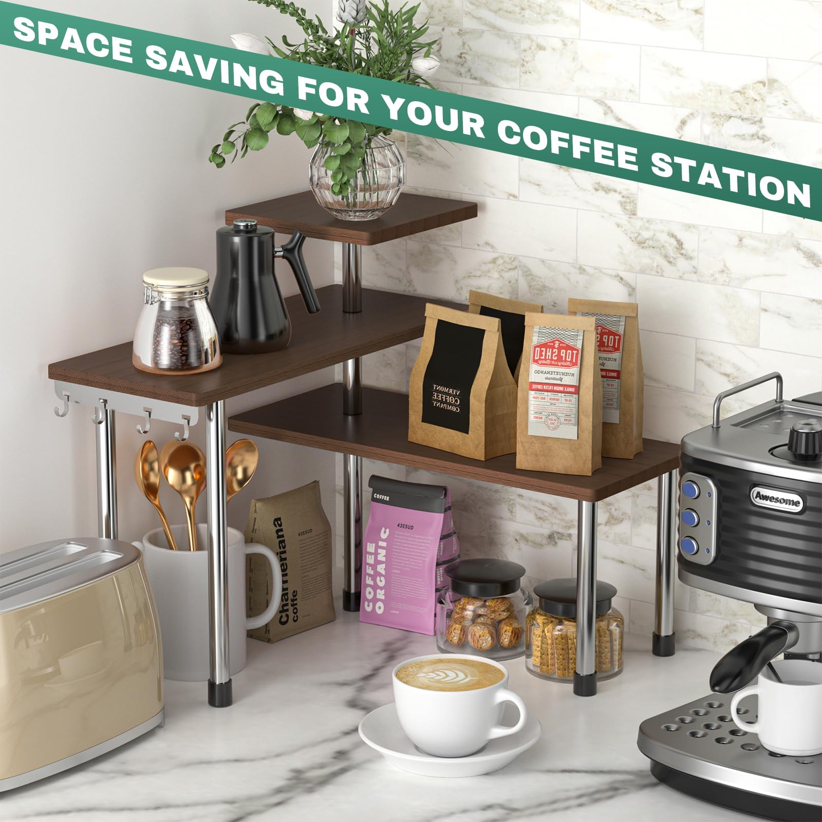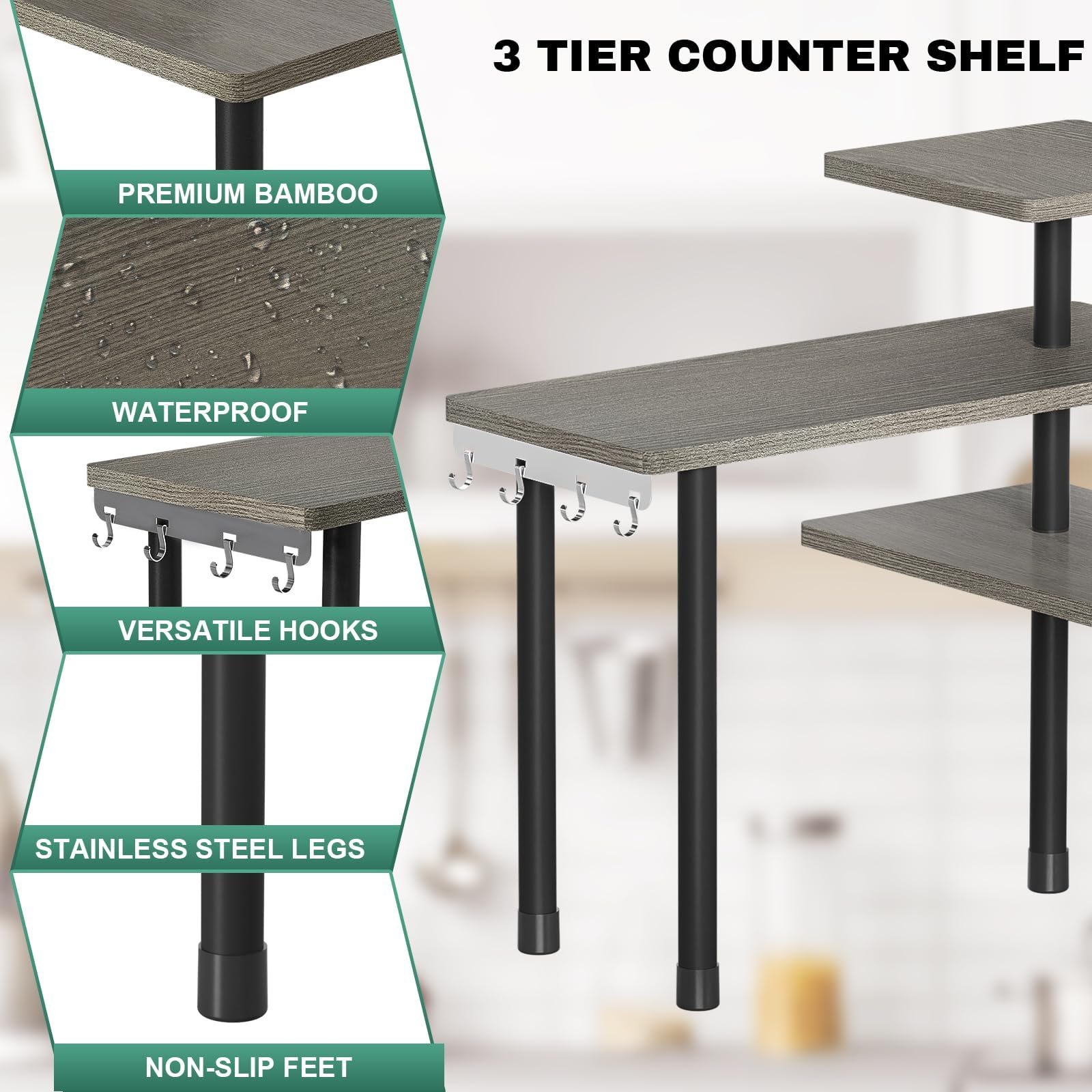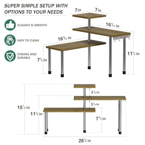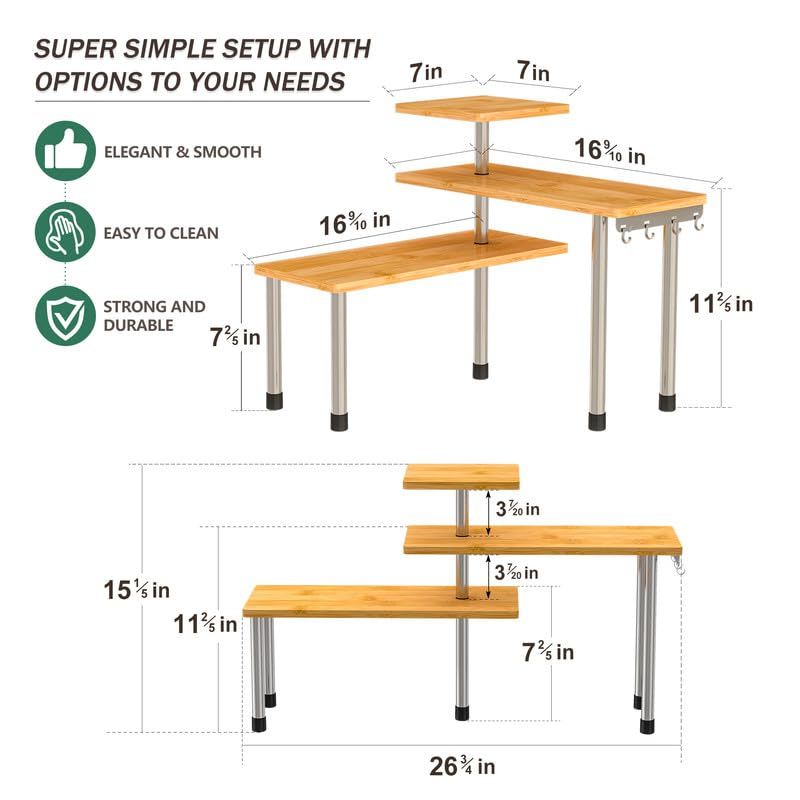 - Maximize Limited Space: This counter shelf is your solution for saving space. Its adjustable 3-tier shelf design allows customization to suit your needs, making the most of even the tightest spaces. Additionally, it's equipped with 4 convenient metal hooks for efficient item organization within easy reach